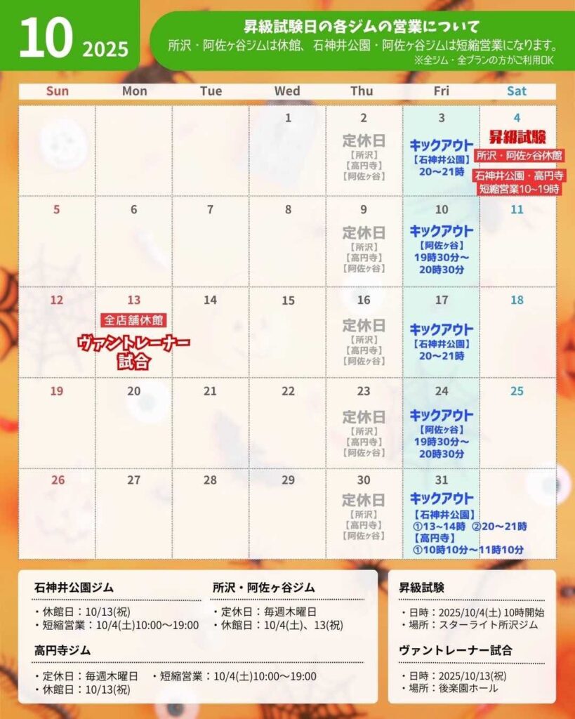 🌟各ジム情報は画像カレンダーでご確認ください(定休日・キックアウト情報等)